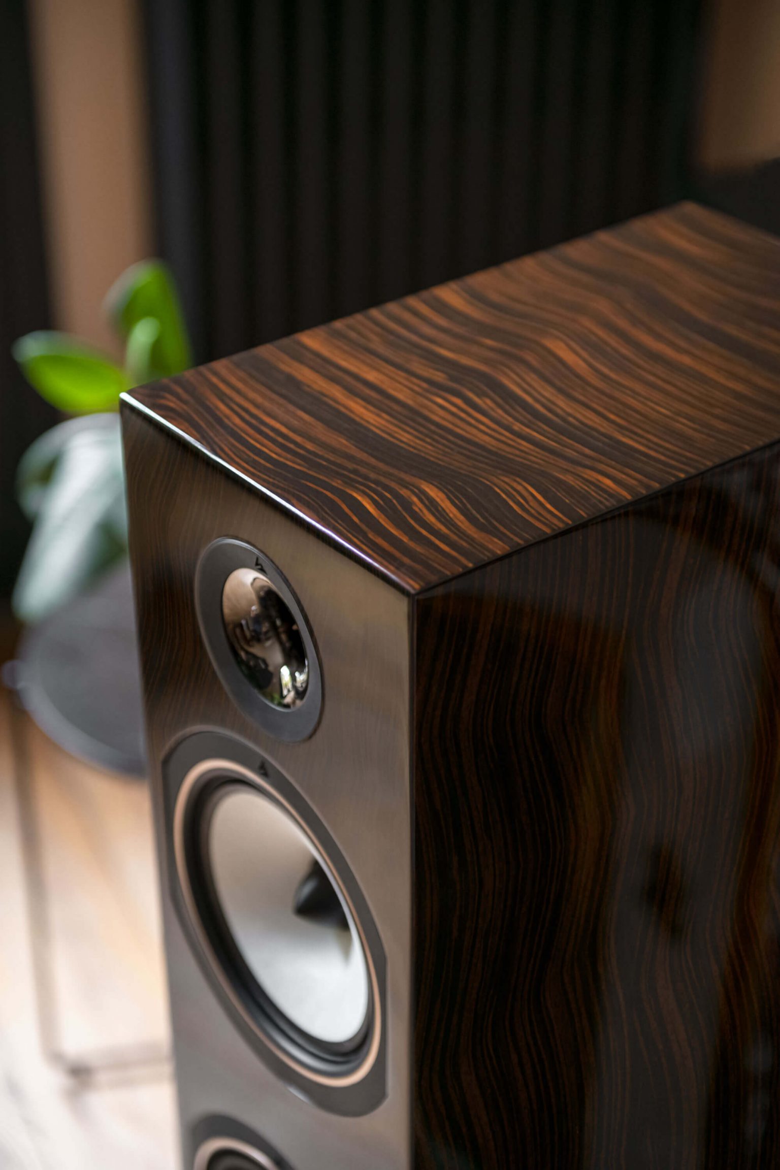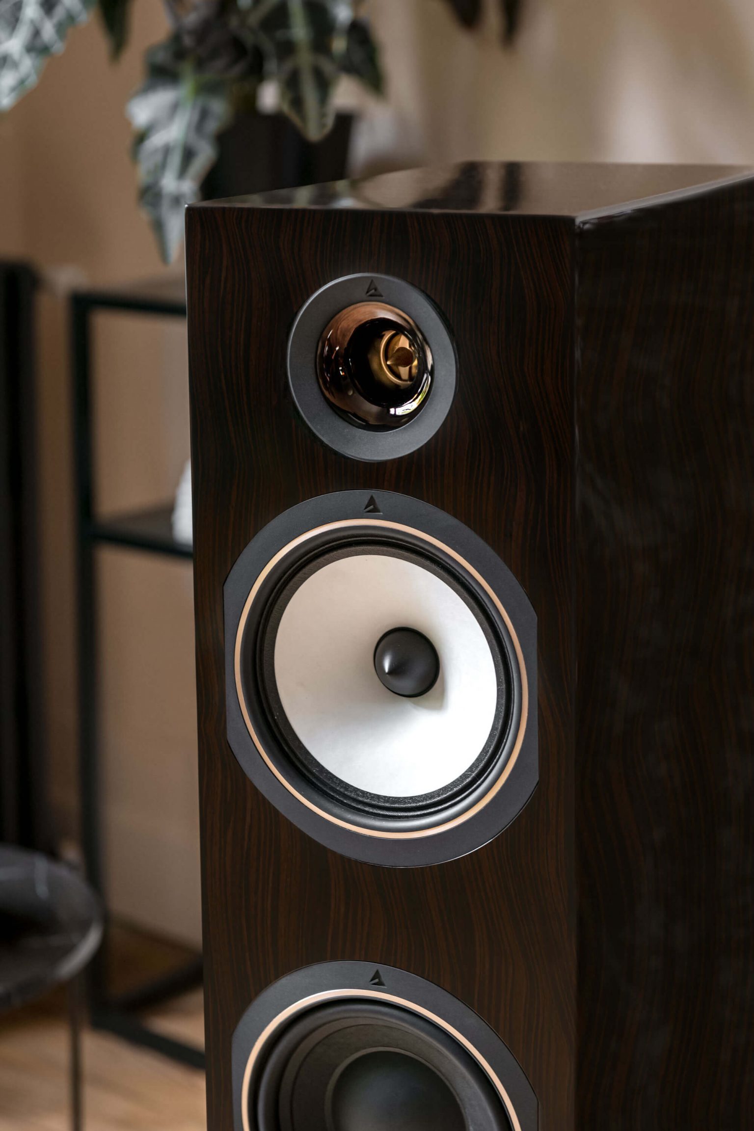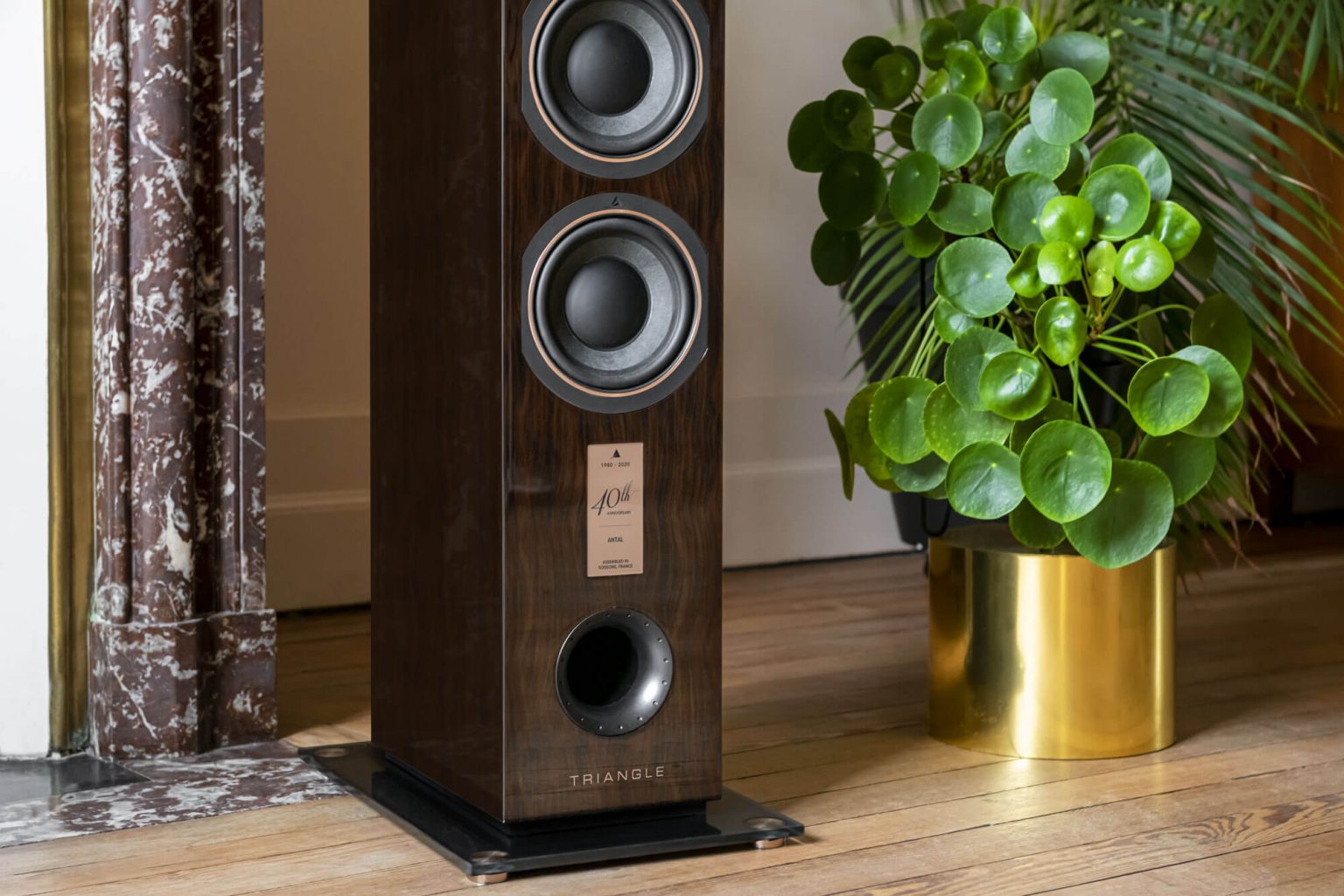 L’Antal 40th floorstander è dotato di un nuovo tweeter a cupola in magnesio anodizzato oro rosa, che offre alta efficienza e distorsione controllata. Il magnesio unisce due qualità desiderate: leggerezza e rigidità. Beneficia anche di due nuovi woofer. L’utilizzo di una membrana composita in pasta di legno, lino e fibra di carbonio, associata ad un driver di generose dimensioni, garantisce una notevole erogazione delle frequenze più basse.