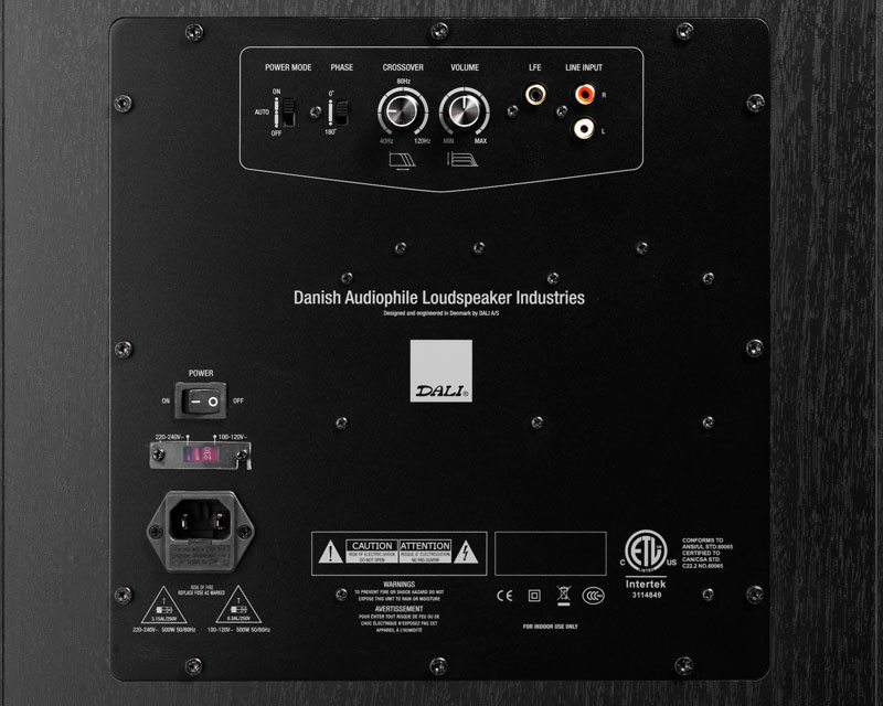 Sezione di potenza da 450 watt RMS in Classe D; modalità di auto-accensione, controllo della fase 0-180 gradi, regolazione della frequenza di taglio tra 40 e 120 Hz, regolazione del volume, ingresso LFE e ingresso linea RCA.